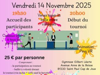 Le Ping Saint Paulais Pays de Cocagne vous propose lors de sa 7ème édition, un tournoi Inter-Entreprises-Partenaires, le vendredi 14 novembre à St Paul Cap de Joux, qui vous permettra de porter haut les couleurs de votre entreprise en vous défiant avec fair-play bien-sûr mais aussi avec détermination, à d’autres entreprises. Nul besoin d’être partenaire du club pour y participer. Un buffet en accès libre permettra aux joueurs de faire le plein d’énergie entre chaque match. La remise des prix à tous les participants clôturera la soirée. Le PSPPC renouvelle ce tournoi, pour vous et vos salariés. Offrez un moment convivial et sportif à vos collaborateurs et réunissez-vous dans un cadre sympathique. Un atelier découverte PING VIRTUEL (VR) sera mis à votre disposition tout au long de la soirée. Venez tester cette nouvelle pratique ! Nous vous ouvrons nos portes pour que vous puissiez vous détendre et prendre du plaisir […]